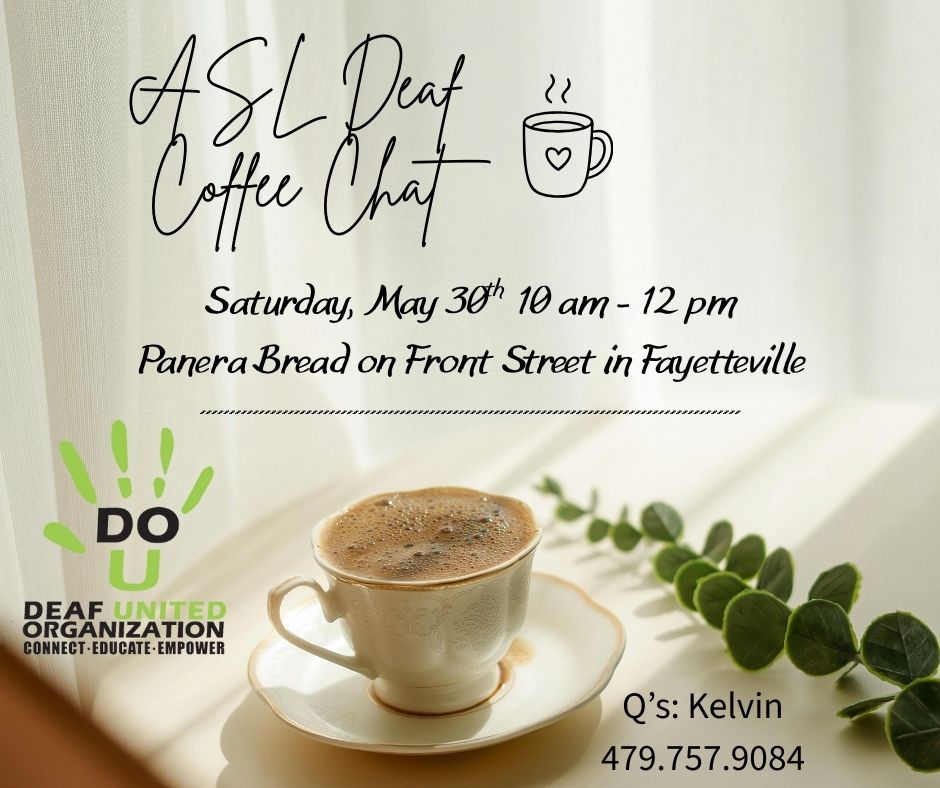 sat30may10:00 amsat12:00 pmASL Deaf Coffee Chat – May 30Join us at Panera Bread on Front St – May 3010:00 am – 12:00 pm(GMT-05:00) 3638 N Front St, Fayetteville, AR